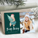 Deseje aos amigos e à família um Feliz Natal com os nossos cartões com fotos de férias da Feliz Beary! Os cartões de natal bonitos apresentam um urso marrom vestindo um chapéu de Papai Noel carregando uma árvore de Natal de volta ao seu toca-discos. As palavras "Feliz de Beary" são apresentadas abaixo em uma fonte de script branca, escrita à mão contra um fundo verde da floresta. Personalize adicionando sua foto favorita e seus nomes. No verso do cartão, apresenta-se um padrão de árvore de Natal giro em vários tons de verde e verde.