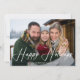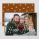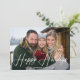 Cartão com fotos moderno de feriado com "feriados felizes" exibido em um script branco manuscrito sobre sua foto horizontal. Personalize a frente do cartão com fotos de férias com seu nome de família e o ano. A carta se reverte para um pão de gengibre e padrão branco de flocos de neve.