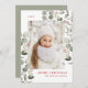 Cartão de férias elegante com sua foto vertical cercada por groselhas de cor-d-água vermelha, folhas de eucalipto e folhagem verde-salgada. Personalize a frente do Cartões de foto de Natal botânico com uma saudação personalizada, seu nome de família e o ano em letras vermelhas. A placa reverte para exibir sua mensagem personalizada em letras brancas com um fundo de sábio escuro.