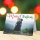 Elegante cartão com fotos Feliz de Natal com bela caligrafia em vermelho e verde. Esta placa dobrada de fotografia da família de feriados moderna apresenta um roteiro maravilhoso e seu nome em branco sobre a foto de sangria do cheio.