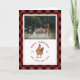 Ilustração de um frango usando um chapéu de Papai Noel. A borda e o verso têm um design de padrão xadrez de búfalo vermelho e preto. Personalize com a foto da sua família na frente. Personalize o texto interno.