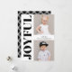 Na moda, cartão com fotos de feriado moderno, com "Joyful" em uma letra preta de tendência, em negrito, ao longo do lado esquerdo da placa. Personalize a frente do cartão, adicionando duas das suas fotos favoritas e o seu nome. O cartão de feriado bonito se reverte a apresentar duas fotos adicionais, o ano, e um padrão de xadrez branca-chic com fundo preto. Projetado para coordenar com nossa coleção de feriados alegre moderna.