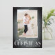Sua foto favorita em um padrão de tecido preto com seus nomes e Feliz Natal saudando no fundo em letra chic. Selecione Matte para o papel mais pesado e High Definition para obter a melhor qualidade de foto.