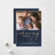 Adicione a sua foto de família a este fundo azul-d-água suave, clássico e elegante marinho azul com efeito ouro texto de script de rico "feliz" Natal. Saudações à sua família e amigos com classe e sofisticação nesta temporada de férias com este cartão de saudação de na moda. Design Copyright © CustomChristmasPhotoCards.com Exemplo Imagem Fotografia © Storytree Studios, Stanford, CA