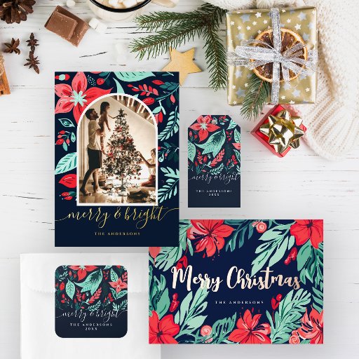 Cartão De Festividades Foto de Natal Vermelho Floral Botânico Verde