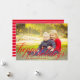 O cartão com fotos sazonal de Natal apresenta um design de sobreposição de script de caligrafia manuscrito vermelho "Feliz Feriados" com texto serif personalizado que pode ser personalizado com o ano e sua família / nome. A parte traseira da placa inclui faixas horizontais brancas abstrato com fundo vermelho.