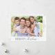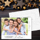 Uma simples placa natalícia com um design mínimo e uma foto horizontal que preenche a frente da placa plana. O design é acentuado com o tradicional script de estilo manuscrito "Feliz Natal" em cima da foto. O verso oferece texto personalizado para que você adicione sua própria mensagem pessoal.