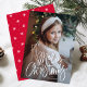 Cartão com fotos de feriado bonito com "Feliz Natal" apresentado na parte inferior da carta num roteiro branco escrito à mão. Personalize o cartão branco de Natal com sua foto vertical e seu nome de família. A carta se inverte para um padrão vermelho e branco de floco de neve.