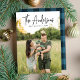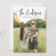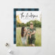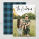 Cartão de férias moderno com o nome da sua família, apresentado no topo do design num script de assinatura manuscrito preto. Personalize o cartão com uma saudação personalizada, o ano e a sua foto vertical de sangria de cheio. A placa de feriado de tendência reverte para exibir um padrão de xadrez azul de búfalo marinho rústico.