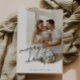 Este cartão com fotos de Feliz Natal apresenta caligrafia manuscrita e uma foto de arco na frente. Insira suas fotos favoritas, adicione um toque pessoal com sua própria mensagem sincera e personalize-a de acordo com seu gosto. Fotos de prostooleh / Freepik.