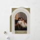 Um moderno cartão com fotos de Feliz Natal em tons de ouro. A foto é um arco mod com borda dourada.
