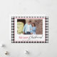 Envie desejos de feriado personalizados com esta xadrez moderna, branca e negra, moderna, "Feliz Natal", com uma foto personalizável. A placa inclui um vazio na parte de trás, permitindo espaço para anotações manuscritas, fazer-a de uma maneira atenciosa e na moda para se conectar com a família e os amigos durante o feriado.