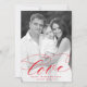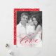 Cartão de Dia de os namorados elegante com sua foto vertical com "amor" exibido em um script de caligrafia vermelha com um gradiente branco opcional. Personalize o cartão com fotos do Dia de os namorados com uma saudação personalizada e seu nome. A placa de Dia de os namorados de fotos reverte para exibir um padrão cardíaco branco e vermelho divertido.