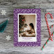 Este cartão festivo de fotos de solteiro apresenta espaço para uma foto vertical sobre um padrão botânico de Natal roxo e branco desenhado à mão.