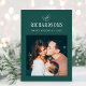 Este simples e minimalista, elegante cartão de férias verde escuro e branco dobrado apresenta sua foto pessoal na frente, e uma foto adicional no dentro, para um total de duas de suas fotos favoritas da família. A caligrafia clássica, juntamente com o texto moderno para o seu nome de família, adiciona um toque de na moda e diz "Feliz feriado". Há também dentro de espaço para sua mensagem pessoal para a família e amigos.