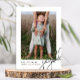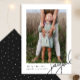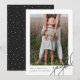 Esta carta de saudação de Natal minimalista contemporânea apresenta uma foto-natalícia elegante com script de caligrafia preta e uma foto em um simples fundo branco. A parte traseira do cartão é um padrão clássico de pontos preto e branco. Compre esta coleção de feriados moderna para obter cores de na moda adicionais e coordenar acessórios de correio.