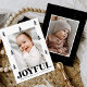 Cartão de Natal festivo com a sua foto vertical cercada por pinheiros pretos desenhados à mão, com fundo branco. "Joyful" é exibido em letras negros com sua saudação personalizada e seu nome de família mostrado abaixo. A alegre carta de Natal reverte para exibir uma foto adicional e um fundo preto com sutis pontos brancos.