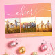 Cartão de feriado mínimo alegre com um fundo de gradiente cor-de-rosa a laranja, três fotos e "animações" escritas em na moda branco com balsas. Você pode personalizar seus nomes e o ano em uma simples tipografia branca.