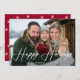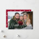 Cartão com fotos moderno de feriado com "feriados felizes" exibido em um script branco manuscrito sobre sua foto horizontal. Personalize a frente do cartão com fotos de férias com seu nome de família e o ano. A carta se inverte para um padrão vermelho e branco de floco de neve.