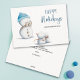 Um cartão de feriado azul adorável com a ilustração de um boneco de neve tirando fotos. Ilustrada e projetada por Patricia Alvarez.