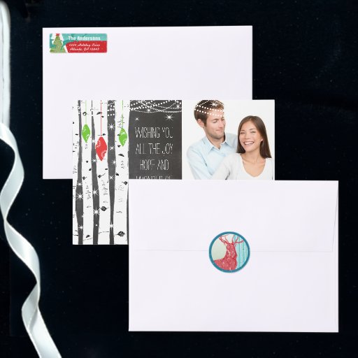 Então esta raposa brincalhona ou pode ser shiba inu tem um suéter Ivory e Orange Aztec e a Coruja tem um chapéu de tricô vermelho russo. A raposa brincalhona está curiosa sobre seu presente embrulhado em papel vermelho rústico e riscado tocado com canetas doces e um topo verde. Mais escondido com setas vermelhas, verdes e marfim, Presentes com riscas e, se isso não for suficiente, as fotos da sua família de preciosos certamente encantarão a família e os amigos. Sabe que os cartões de natal mais populares e modernos têm fotos pessoais. Banner Curvado e Bonito com Texto Curvado mostrando seus nomes e amor e atrás parece uma árvore com as palavras Amor, Paz e Alegria arranhada no tronco da árvore. Cartões com fotos de Férias da Floresta de Barão Russo