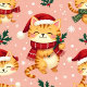 Padrão contínuo de gato de desenho animado com chapéus e cachecóis vermelhos, dormindo e pulando, com visco e flocos de neve em um fundo rosa