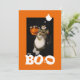 Deseje um Feliz Halloween aos seus amigos e familiares com uma foto do seu gato! Este design fofo de Halloween exibe a foto do seu animal de estimação com a palavra "BOO" com olhos assustados olhando para um fantasma que balança uma aranha. Personalize com seu próprio texto no verso do modelo ou edite ainda mais (por exemplo, altere a cor do fundo, mova elementos, altere a fonte, o tamanho, etc.) na Ferramenta de Design.