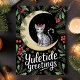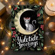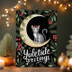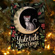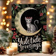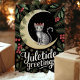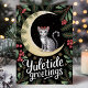 Deseje a alguém um feriado puro com este cartão Yuletide encantador com um gato bonitinho sentado numa lua crescente. Cercado por um santo festivo e galhos de pinheiros contra um céu noturno estrelado, este cartão branco traz alegria de férias com um toque extra de encanto felino. Perfeito para amantes de gatos e para quem desfruta de um toque de magia durante a estação festiva.