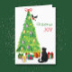 Na frente deste cartão de Natal, um curioso gato negro se senta ao lado de uma árvore de Natal, e assiste como uma touchada pousa nela. Pacotes de presentes embalados de forma breve estão espalhados. O texto vermelho e verde diz "JOY Natal". O dentro é um texto estilizado que diz MERRY CHRISTMAS, e um campo de texto para personalizar.