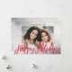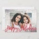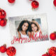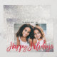 Este cartão com fotos de feriado moderno, mas elegante, apresenta uma foto horizontal solteiro sobre um maravilhoso fundo de imagem reluzente, e uma saudação em vermelho que diz "Felizes Feriados". Este design acomoda uma foto horizontal solteiro na frente. A parte traseira da placa é a mesma imagem de brilho, mas pode ser removida se desejar. Você também pode adicionar outra foto à parte traseira e/ou texto adicional.