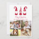 Cartão de férias de colagem fotográfica mínimo com 4 fotos, três gnomos de Natal nórdicos bonitos com chapéus e tunicados de estilo escandinavo vermelho e branco, "Feliz Natal" em uma escrita vermelha e seu nome e o ano em uma simples tipografia vermelha moderna.