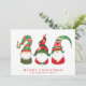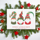 Cartão de férias ao estilo nórdico, bonito, com três gnomos de natal escandinavos bonitos, com chapéus e tunicados de vermelho e verde sazonais. Você pode personalizar a saudação de "Feliz Natal" e seu nome na coordenação da tipografia vermelha.