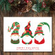 Cartão de Natal simples e bonito, ao estilo nórdico, com três gnomos de Natal giros, escandinavos, com chapéus e tunicados, vermelhos e verdes, sazonais. Você pode personalizar um "Feliz Natal", "Feliz Natal", etc., saudando seu nome e o ano na coordenação da tipografia vermelha.