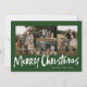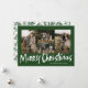 Green Modern Lettering Four Photo Merry Christmas Card (Carta de Natal feliz) apresenta quatro fotos na frente e um padrão verde de Natal festivo no verso.