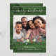 Estes cartões de natal simples e festivos apresentam a sua foto pessoal favorita da família, com a tipografia moderna de guião branca que diz "Feliz Natal" numa madeira rústica e verde parece um fundo. Há um bonito ramo da folhagem de Natal verde, e tradicionais flores vermelhas e brancas, pinecones, e groselhas vermelhas para um olhar que é clássico e totalmente atualizado.
