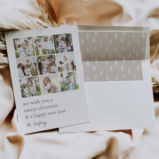Um design moderno mínimo de cartões de feriado com 9 fotos em um layout de colagem em grade quadrado, com uma saudação personalizável e assinatura familiar por baixo. Mostrado com "desejamos-lhe um feliz natal e um feliz ano novo" com os seus nomes em letra manuscrita.