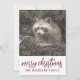 Guaxinim na neve de inverno, cartão de Natal de férias. Adicione o nome da sua família. Estilo de bosques selvagens.