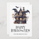Belo cartão de Dia das Bruxas com uma bela casa assombrada, abóboras e morcegos. Personalize facilmente este cartão de Halloween com seu nome de família e texto.