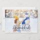 cartões com fotos de feriado personalizados com barato simples para personalização. Esta design moderna chic tem uma borda de confete falsa e texto de caligrafia na moda. O texto diz "Feliz Chanucá". Personalize-o com suas fotos e adicione seu nome de família e o ano. O verso tem um fundo de brilho dourado falso ou usa o espaço para fotos e texto adicionais. Use as ferramentas de design para editar o texto, adicionar mais fotos e criar um único design de cartão com fotos Hanukkah.