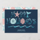 Cartão de Natal plano para o tema da praia, com uma espinhosa "Feliz Feriados", uma concha de cerco, uma cauda de baleia e um design de tipografia de ondas oceânicas com um padrão náutico no verso, em tons de azul marinho, turquesa e coral. Trabalho de arte original do KL Stock.