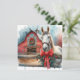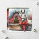 A agricultura bonito personalizou o cartão de Natal do país. Bonito cavalo branco de aquarela com um arco vermelho em volta do pescoço. O fundo é um celeiro rústico vermelho, todo escondido em decorações de Natal.