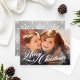 O cartão com fotos de Férias apresenta um design de cobertura de "Feliz Natal" em um belo texto de roteiro branco. Personalize com seus nomes, o ano e uma foto favorita do estilo paisagem. Um elegante prata (pode ser personalizado) e um padrão branco de flocos de neve se veste pelas costas. Fotografia © Storytree Studios, Stanford, CA