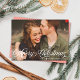 Este adorável cartão com fotos de feriado apresenta um guião retrorreflector branco que diz "Feliz Natal" sobre uma foto horizontal com sangramento de cheio. A parte traseira da placa tem um padrão de stripe diagonal vermelho e branco. Personalize-o adicionando sua própria foto e texto.