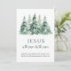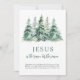 Um design de aquarela de inverno rústico, com pinheiros em uma floresta nevada, com as palavras 'Jesus é a razão da época' e verso bíblia Portanto, o próprio Senhor lhe dará um sinal. Behold, a virgem conceberá e carregará um filho, e chamará Seu nome Immanuel de Isaiah 7:14