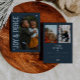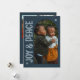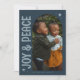 Cartão com fotos timístico e mínimo de férias com um quadro de arco azul com um texto tipográfico que diz "alegria e paz". Você pode adicionar um total de 3 fotos neste cartão na frente e atrás.