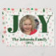 Cartão de férias bonito e colorido com a palavra JOY. O O de alegria é uma foto. Perto do fundo do cartão está o seu nome e o ano. A tipografia está em verde. Uma design divertida e festiva de espirais vermelhas e verdes e árvores de Natal verdes está na frente e atrás. Um cartão delicioso que trará alegria aos sortudos.