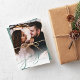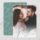 Nosso cartão com fotos de feriado simples e elegante apresenta sua foto vertical ou orientada para retrato favorita de cheio sangrando, esmaecendo para branco no fundo. "Joy" aparece como uma sobreposição de texto verde de script light spruce junto com seus nomes ou nomes de família e o ano. Cartões invertem o padrão das folhas de inverno.