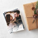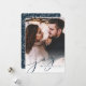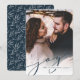 Nosso cartão com fotos de feriado simples e elegante apresenta sua foto vertical ou orientada para retrato favorita de cheio sangrando, esmaecendo para branco no fundo. "Joy" aparece como uma sobreposição de texto de script azul de marinho rico junto com seus nomes ou nomes de família e o ano. Cartões invertem o padrão das folhas de inverno.