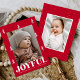 Cartão de Natal de fotografia festiva com a sua fotografia vertical rodeada de pinheiros brancos desenhados à mão com fundo vermelho. "Joyful" é exibido em letras brancas em negrito com sua saudação personalizada e seu nome de família mostrado abaixo. A alegre carta de Natal reverte para exibir uma foto adicional e um fundo vermelho com sutis pontos brancos.