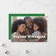 Este cartão com fotos simples e na moda apresenta uma camada de texto branco boho e caprichoso que diz "Joyous Kwanzaa", com espaço para sua foto pessoal favorita. A parte de trás do cartão está verde.